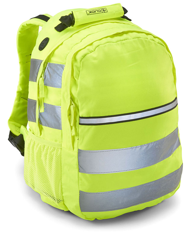 * 600d Polyester with padded back panel* Quick release buckle fastening straps * Hi Vis saturn yellow fabric with retro-reflective tape* Internal black lining with mesh pocket * Anti-fatigue padded straps and carry handle* Two way nylon zips* Multiple pockets* Mobile phone pocket on strap* Secure MP3 player/mobile phone cable outlet from bag* 25 ltr capacity* Product does not meet EN ISO 20471Ideal for walkers, cyclists and commuters in low light conditions.* Does NOT conform to EN ISO 20471
